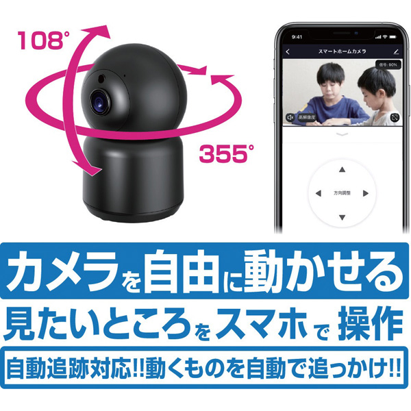 左右355°、上下108°首振り可能!スマホでも遠隔操作できる室内用カメラ。